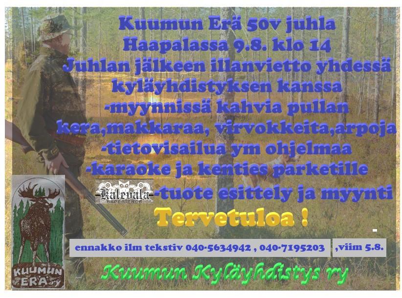 Kuumun kyläyhdistys ry ja Kuumun Erä ry järjestävät yhdessä Kuumun kylätapahtuman lauantaina 9.8.2025 metsästysmajalla Haapalassa. Samassa yhteydessä Kuumun Erä ry juhlii 50 v synttäreitään. Ilmoittautuminen ti 5.8. mennessä tekstarilla joko 040 5634942 tai 040 7195203.